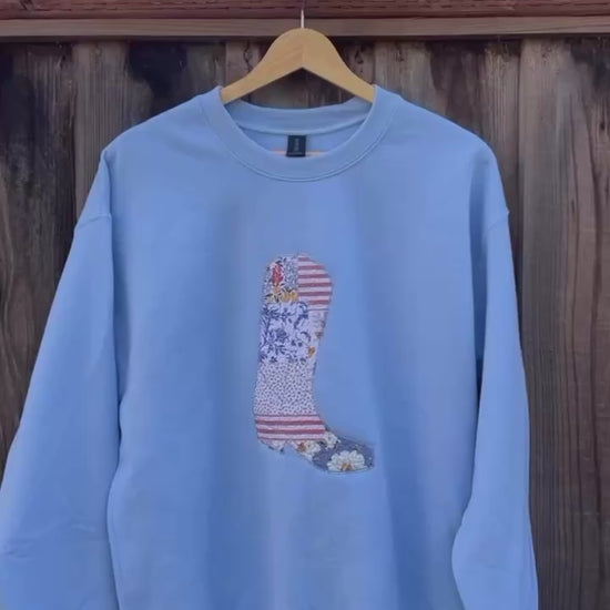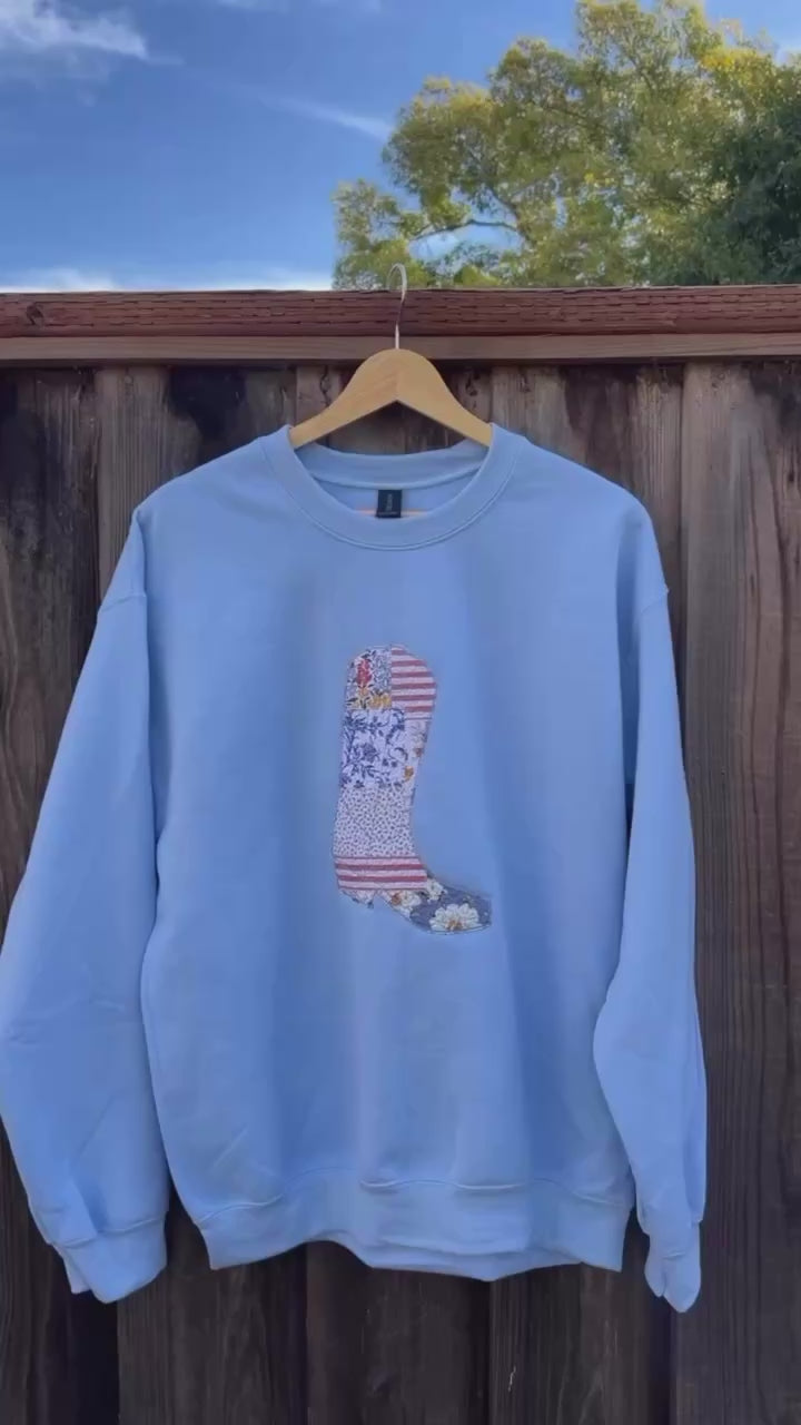 Saddle up in cozy western style with our Patchwork Boot Embroidered Crewneck Sweatshirt. This soft light blue pullover features a fabric patchwork cowboy boot design stitched right into the chest; bringing rustic charm and rodeo vibes to your everyday outfit. Whether you’re heading to the county fair, a fall market, or just love all things Western, this sweatshirt is your go-to.